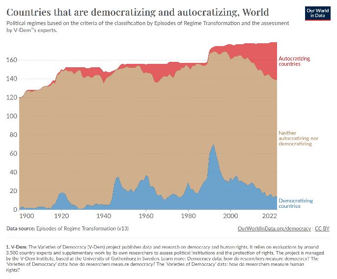 Man kann auch zu einem anderen Schluss kommen. Dazu müssen wir uns zunächst bewusst werden, dass wesentlich mehr Staaten von sich behaupten demokratisch zu sein. Allerdings kommen viele von diesen nicht auf die Liste, weil sie de facto nicht sind. Viele Länder, die sich den Schein einer durch das Volk legitimierten Regierung geben, sind in Wirklichkeit eben doch Autokratien oder gar Diktaturen, weshalb sie nicht gezählt werden. Beispiele fallen einem da sofort ein. Im Jahr 2024 fanden über 40 nationale Wahlen statt – inklusive der Europawahlen, gewissermassen ein Weltsuperwahljahr. Von den betroffenen Ländern sind jedoch laut Klassifikation des Projekts „Varieties of Democracy (V-Dem, v-dem.net)“ nur etwa 20 «elektorale» oder «liberale» Demokratien. Nur diese Staaten figurieren dann auf der Liste der Demokratien. Das erscheint zunächst einmal plausibel. Schliesslich sollte nur Demokratie draufstehen, wo wirklich Demokratie drin ist.